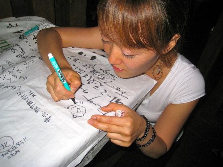 JUNTOSのフラッグにみんなで寄せ書き。